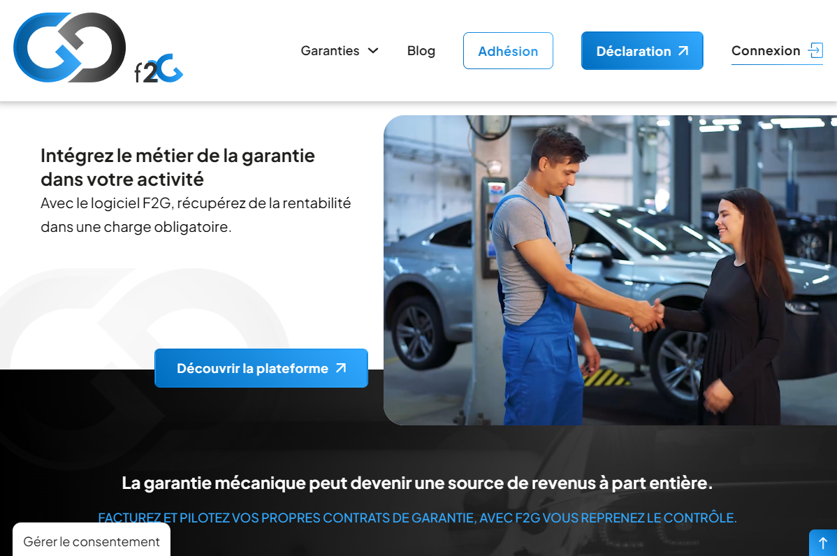 F2G est une solution digitale dédiée aux professionnels de l’automobile, pensée pour centraliser et simplifier la gestion des garanties et des pannes. La plateforme permet notamment de saisir une garantie rapidement, d’éditer automatiquement les contrats, de suivre les dossiers en temps réel et de piloter l’activité via un tableau de bord clair.