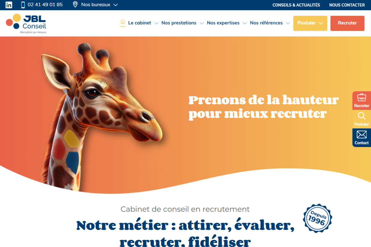 JBL Conseil a fait appel à l’agence web Enjin pour la création de son site vitrine, l’hébergement, la maintenance, le webdesign et le SEO. Les enjeux ? Renforcer sa visibilité en ligne, valoriser son expertise et offrir aux entreprises comme aux candidats une expérience fluide et professionnelle.