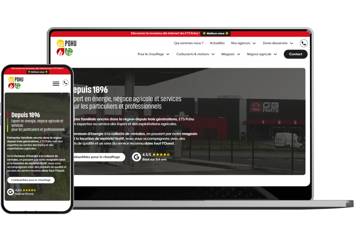 Les Établissements POHU ont confié à Enjin la refonte de leur site vitrine. Les objectifs : moderniser l’interface, structurer les contenus par métiers et par besoins, valoriser les agences et les services et proposer un parcours clair orienté action.